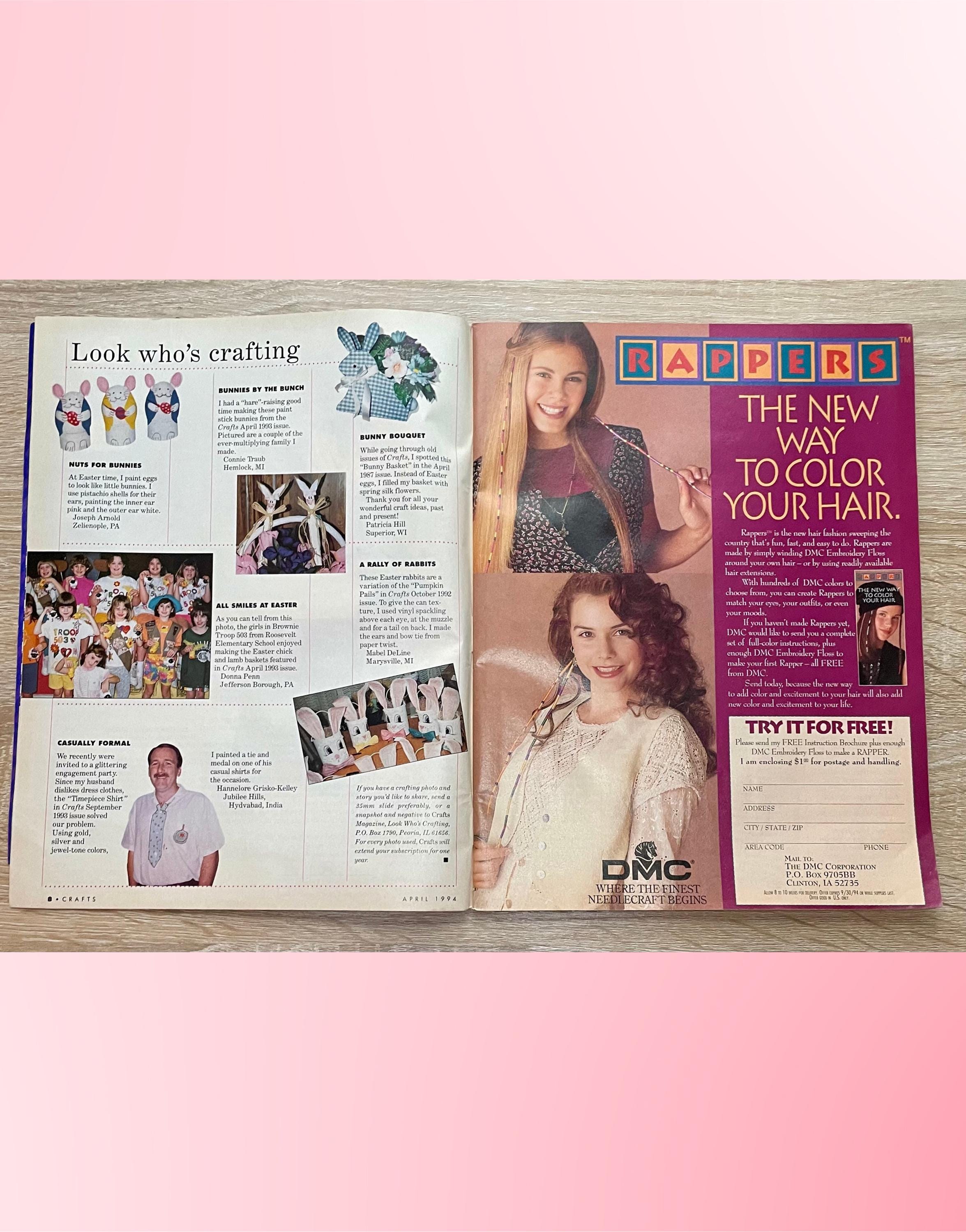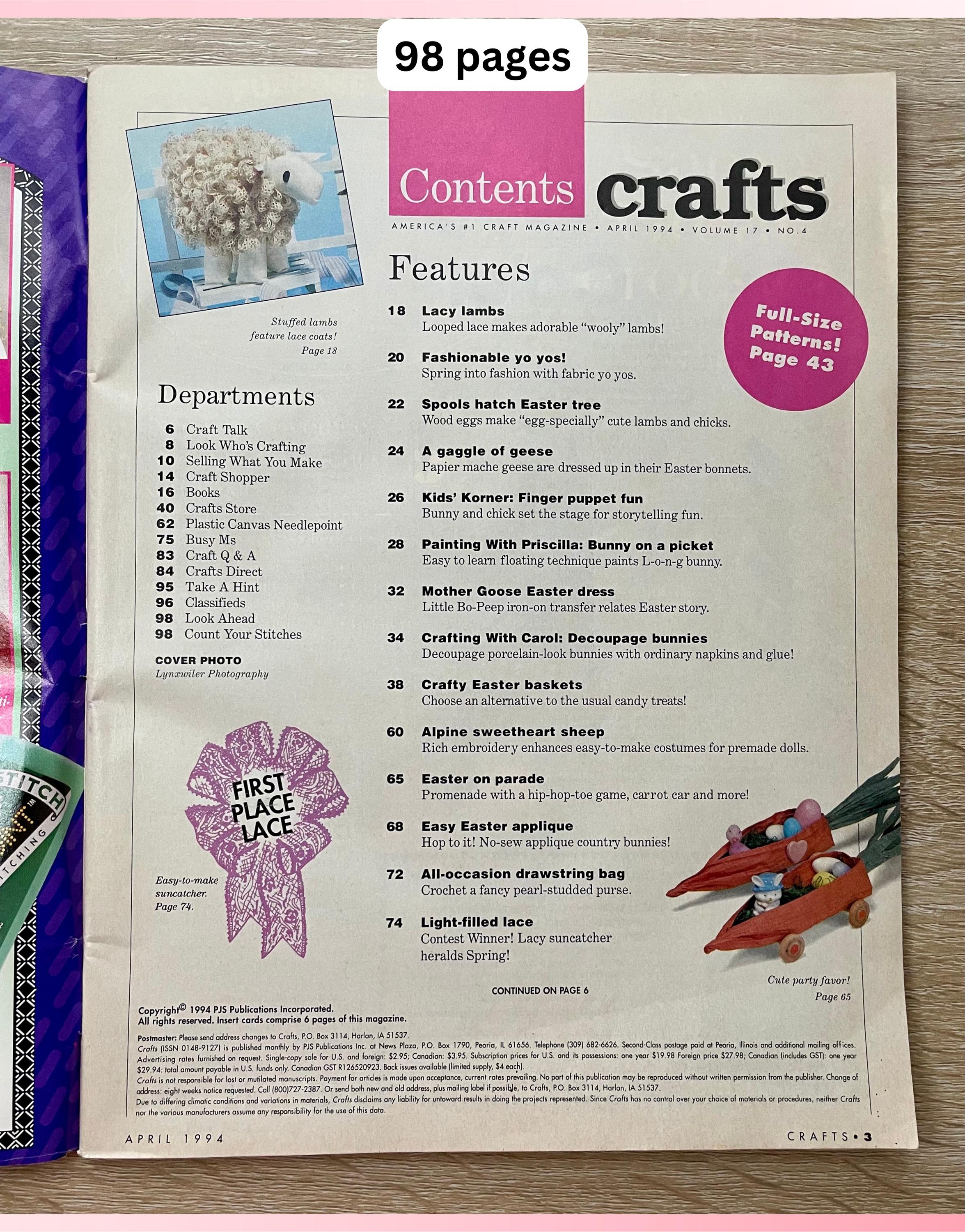 Magazine from the 1990s. CRAFTS, America's #1 Crafting Magazine, April 1994. Special pattern sheet included. 98 pages. Front cover is torn off at bottom right corner, see photo.