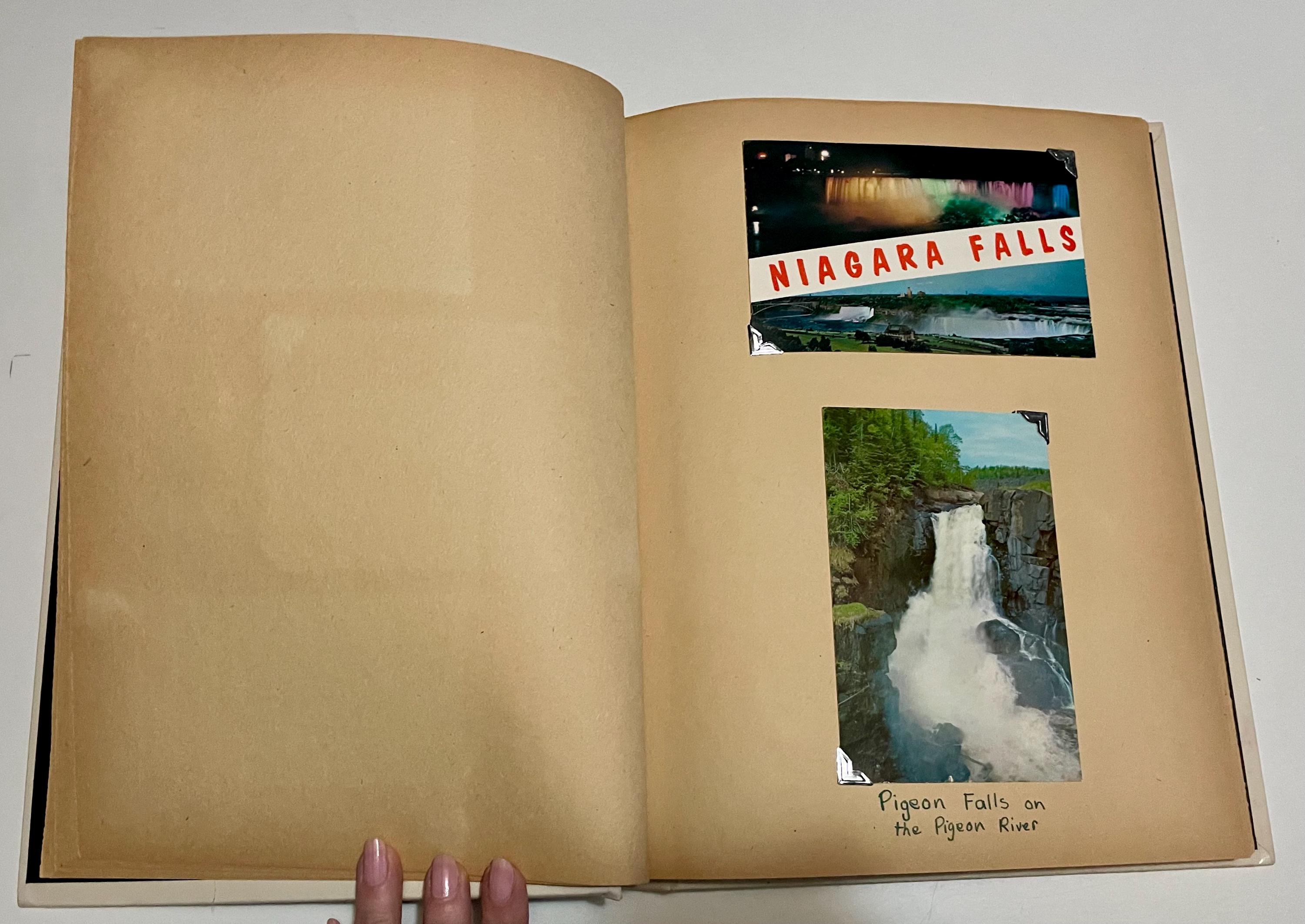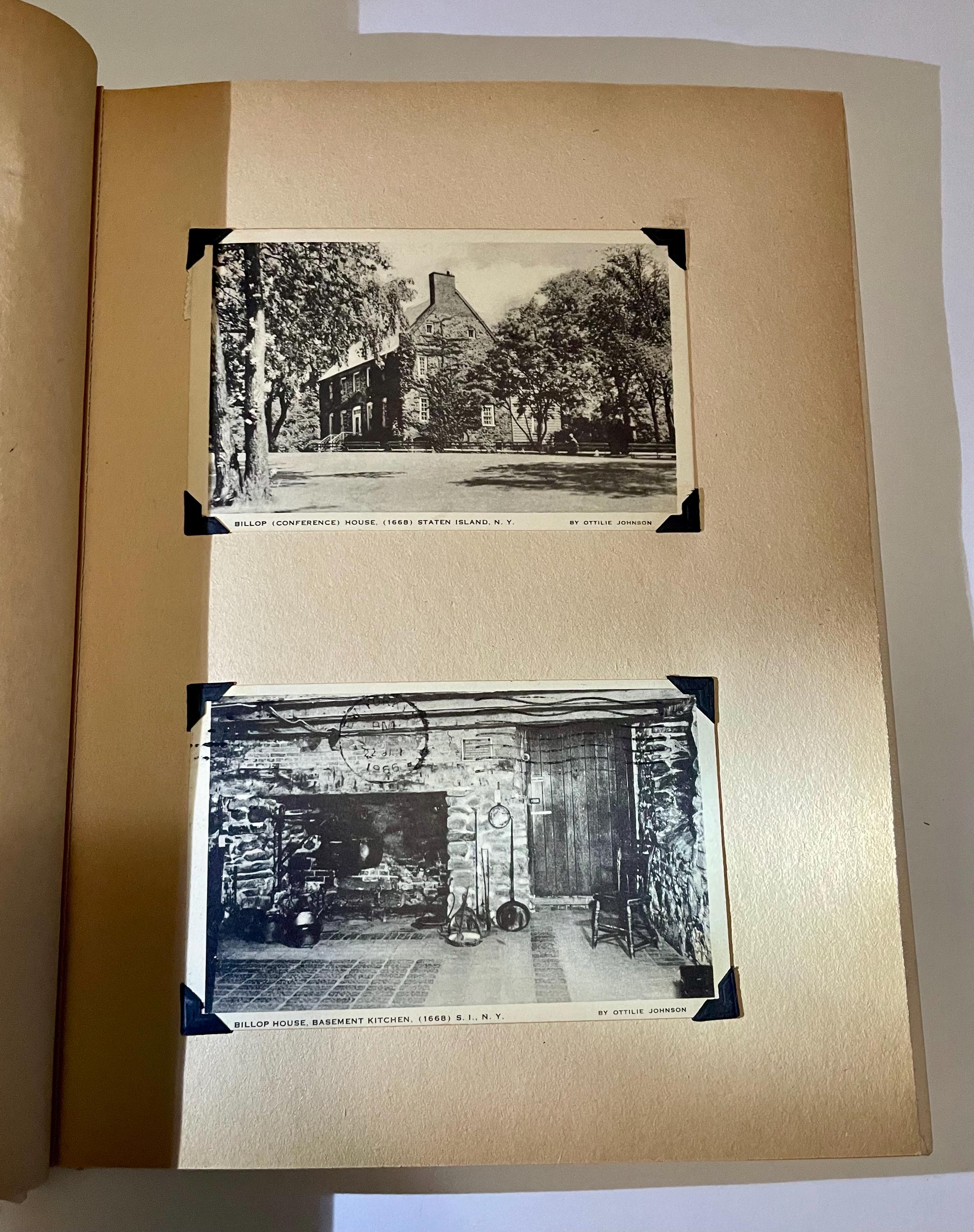 48 vintage postcards in vinyl scrapbook. Scrapbook is approximately 12 inches tall by 10 inches wide & 1-1/4 inch thick.