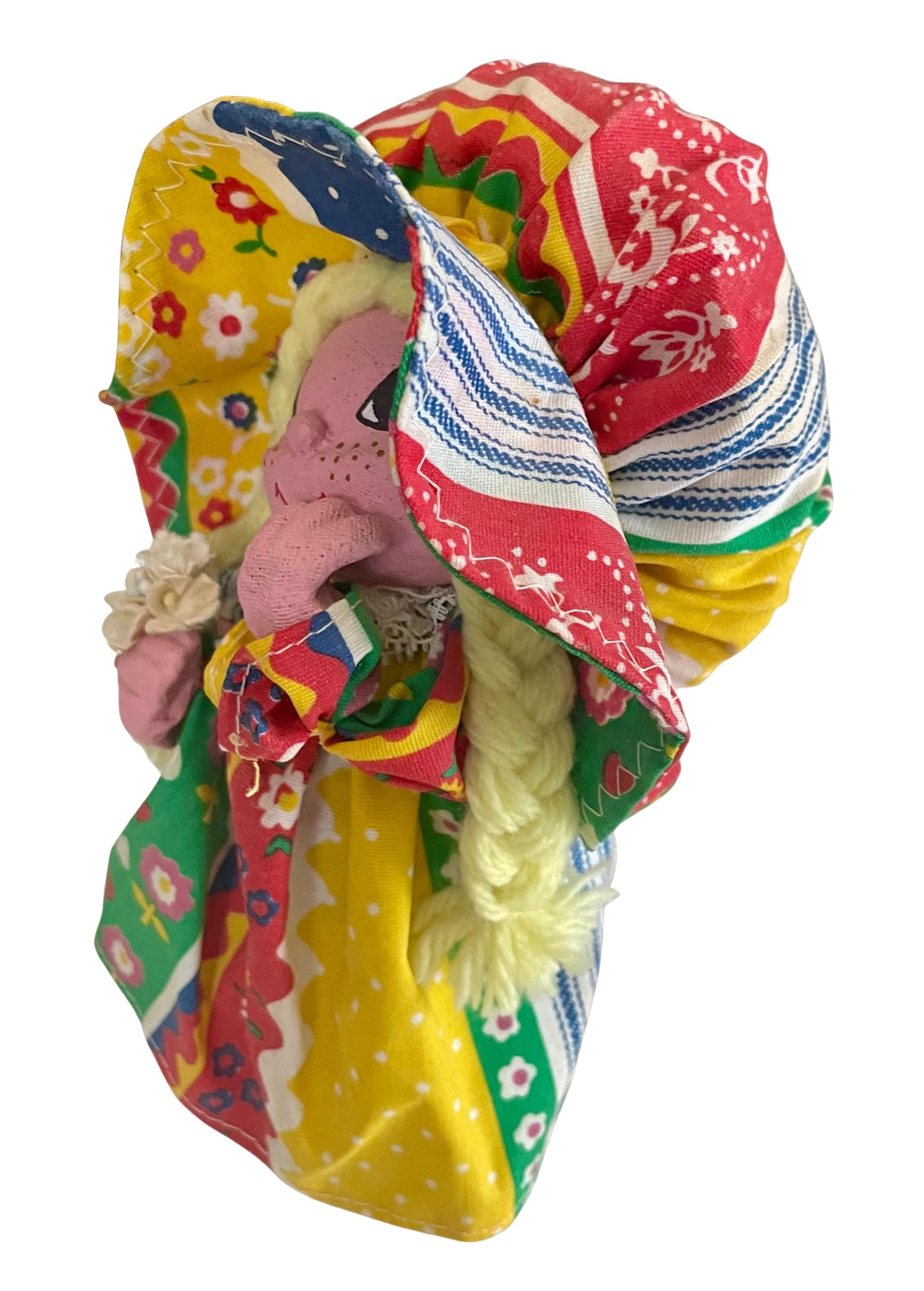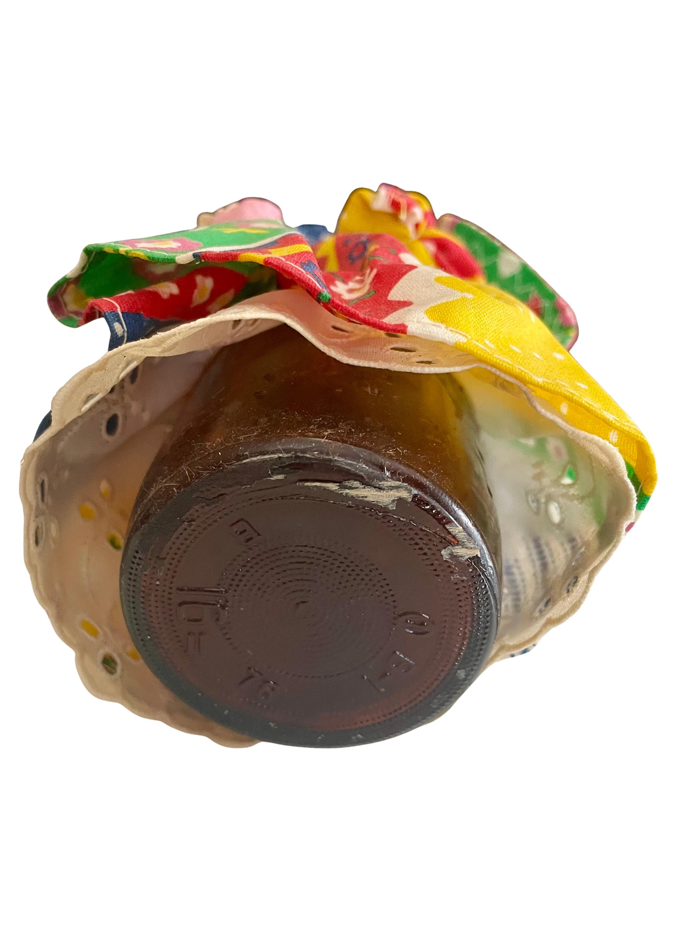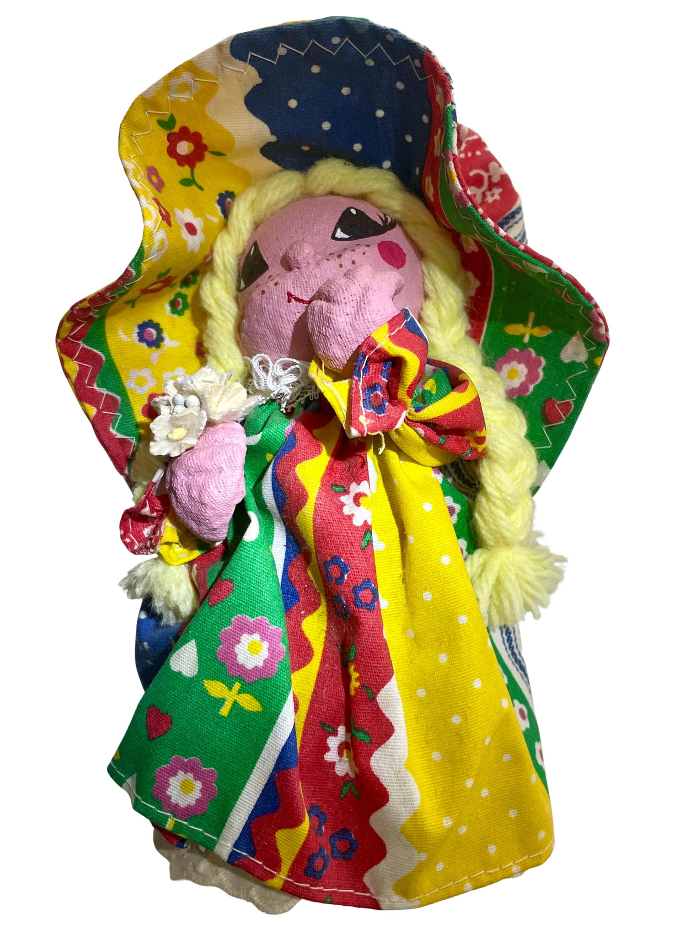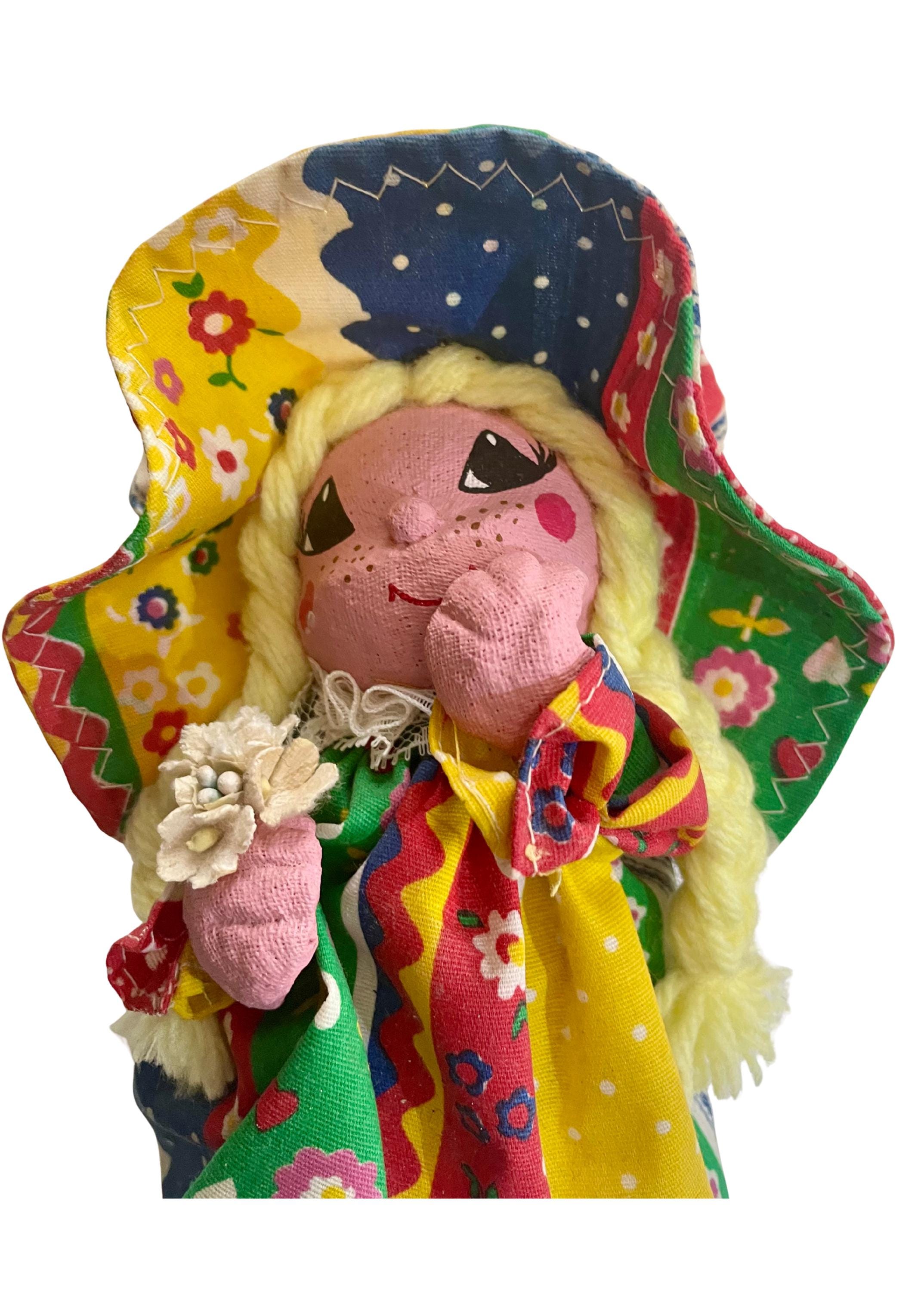 Handmade Folk Art Doll. Cute girl with a matching dress & bonnet, blonde braids, holding a flower. The base to the doll is a brown glass jar/bottle.