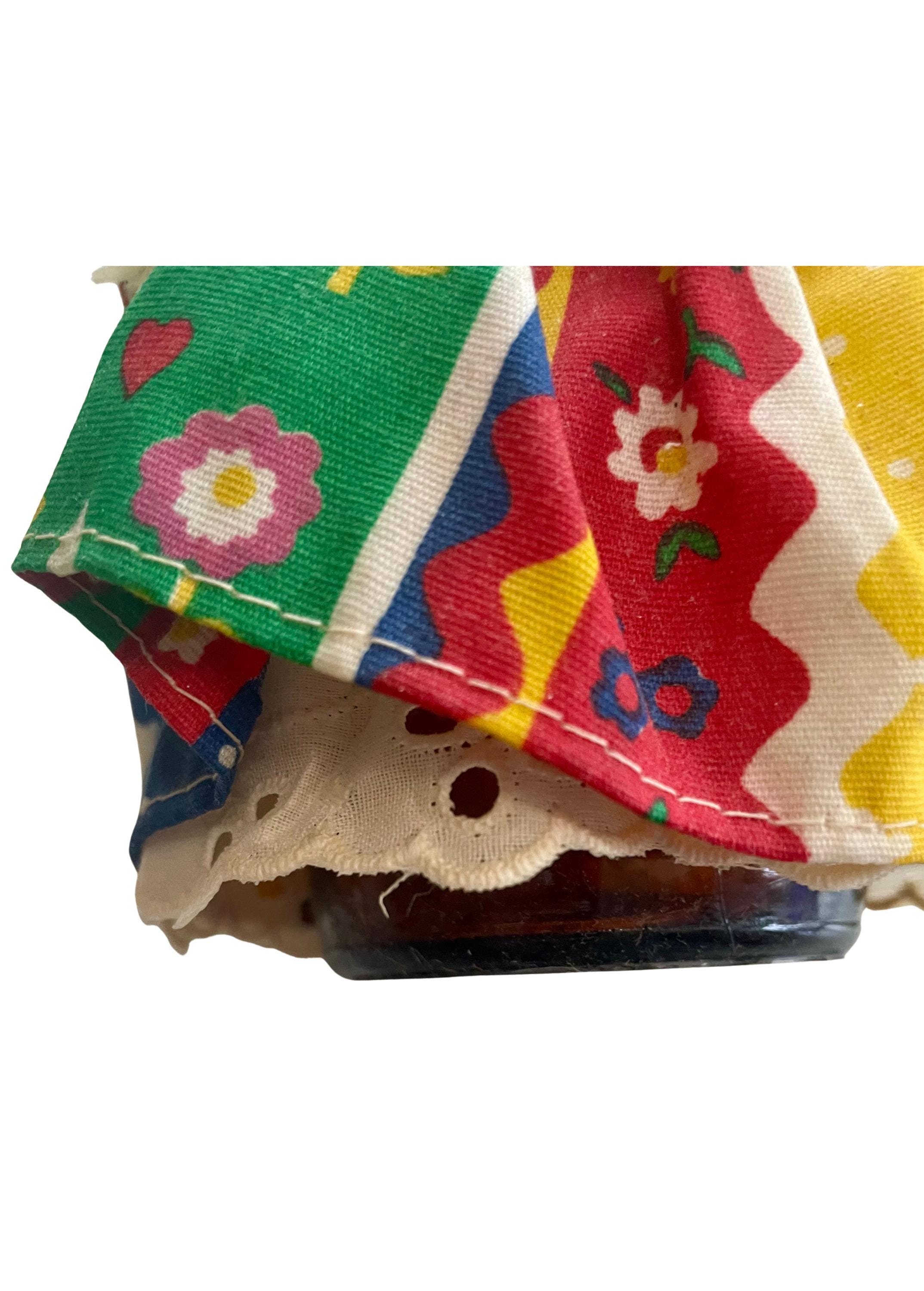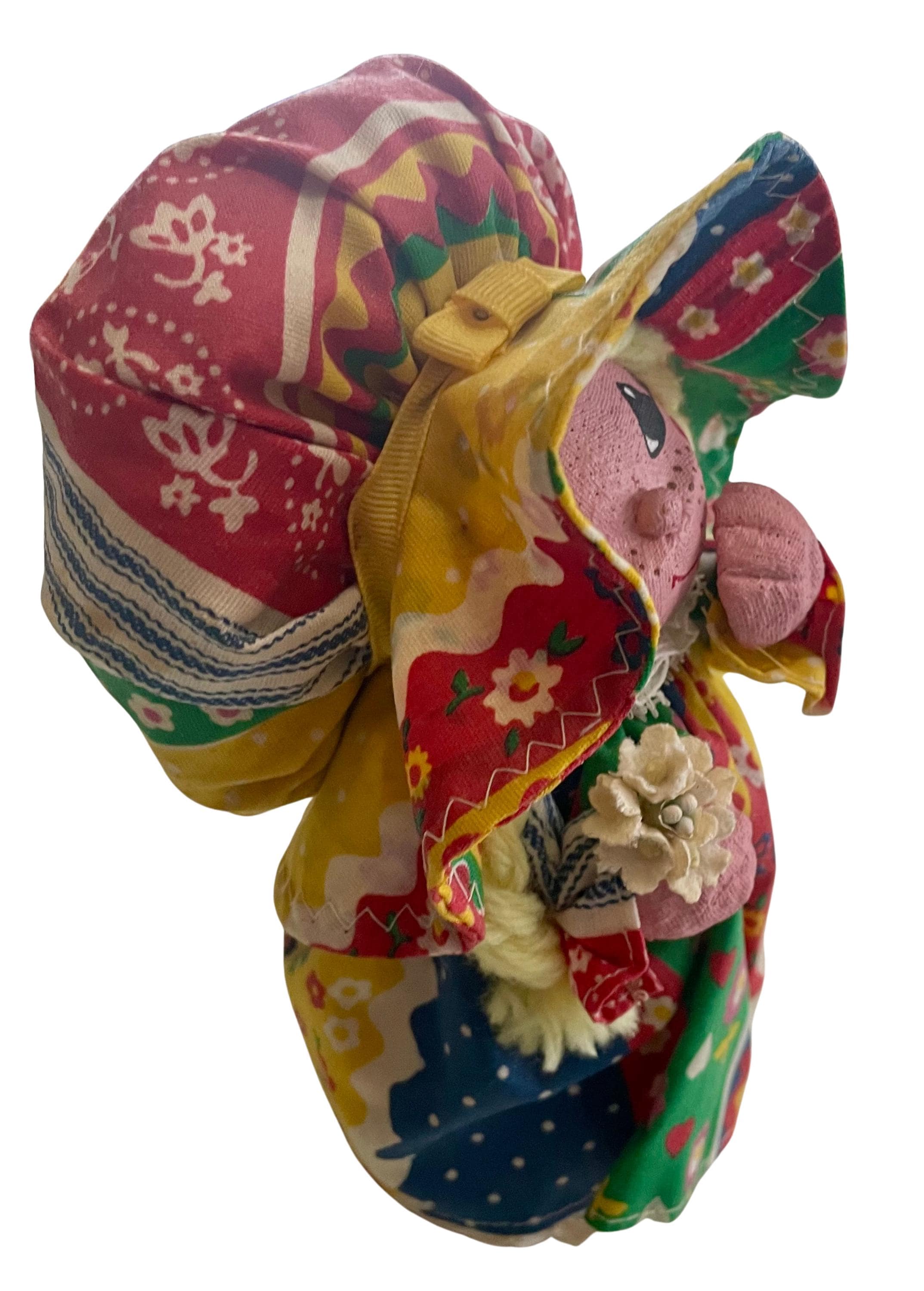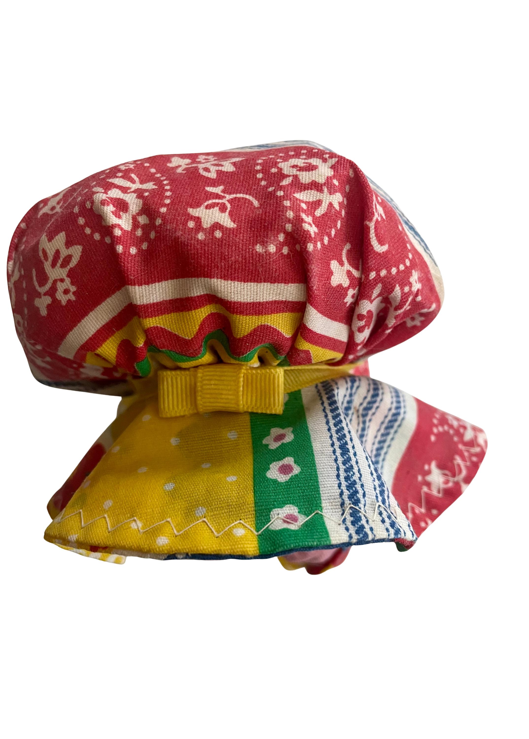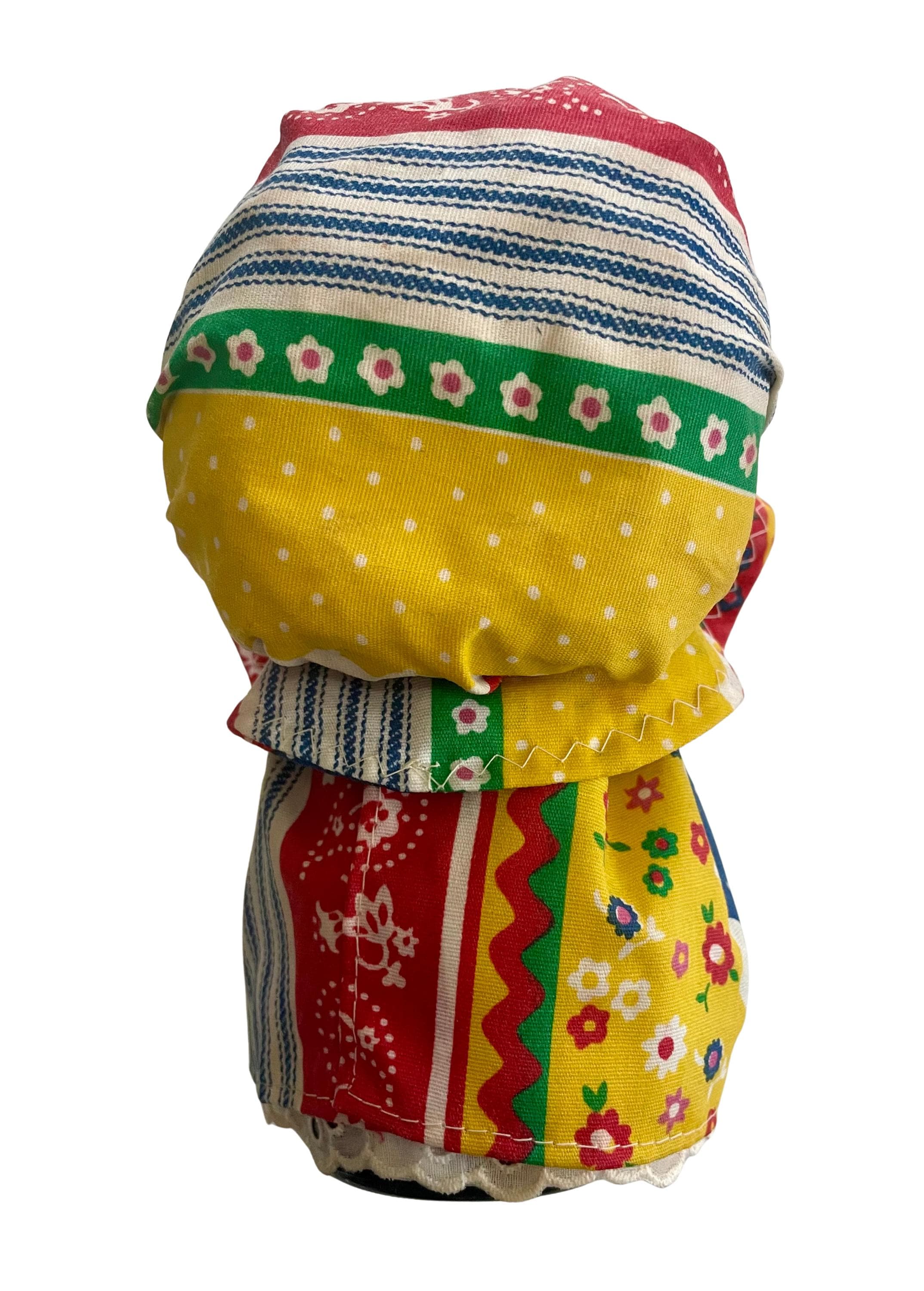 Handmade Folk Art Doll. Cute girl with a matching dress & bonnet, blonde braids, holding a flower. The base to the doll is a brown glass jar/bottle.