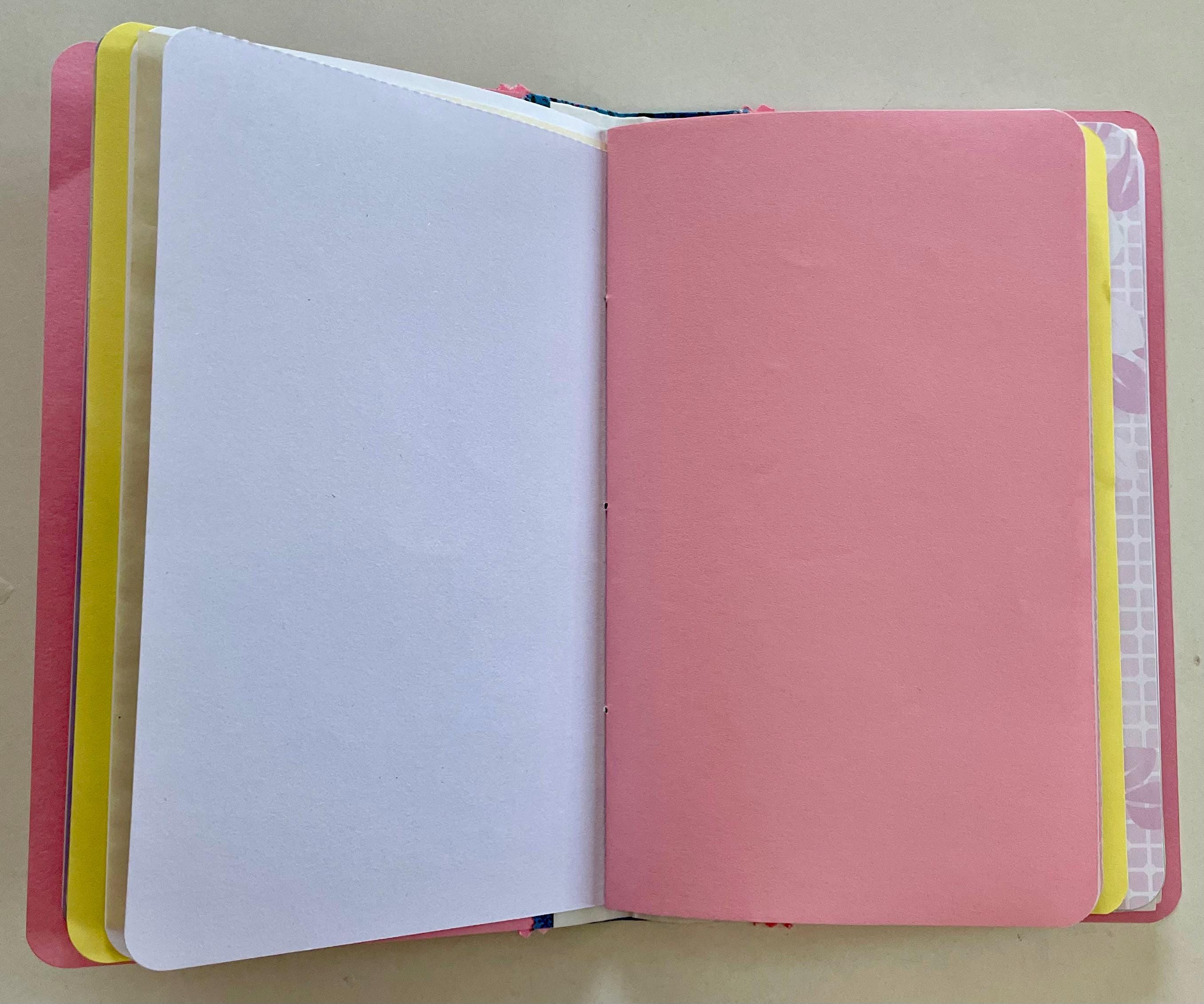 Handmade Art Journal; 9" x 6", 72 pages total including 4 pages of tracing paper, 16 pages of sketch paper, 4 pages of craft paper, & computer printer paper both plain & pastel colors.