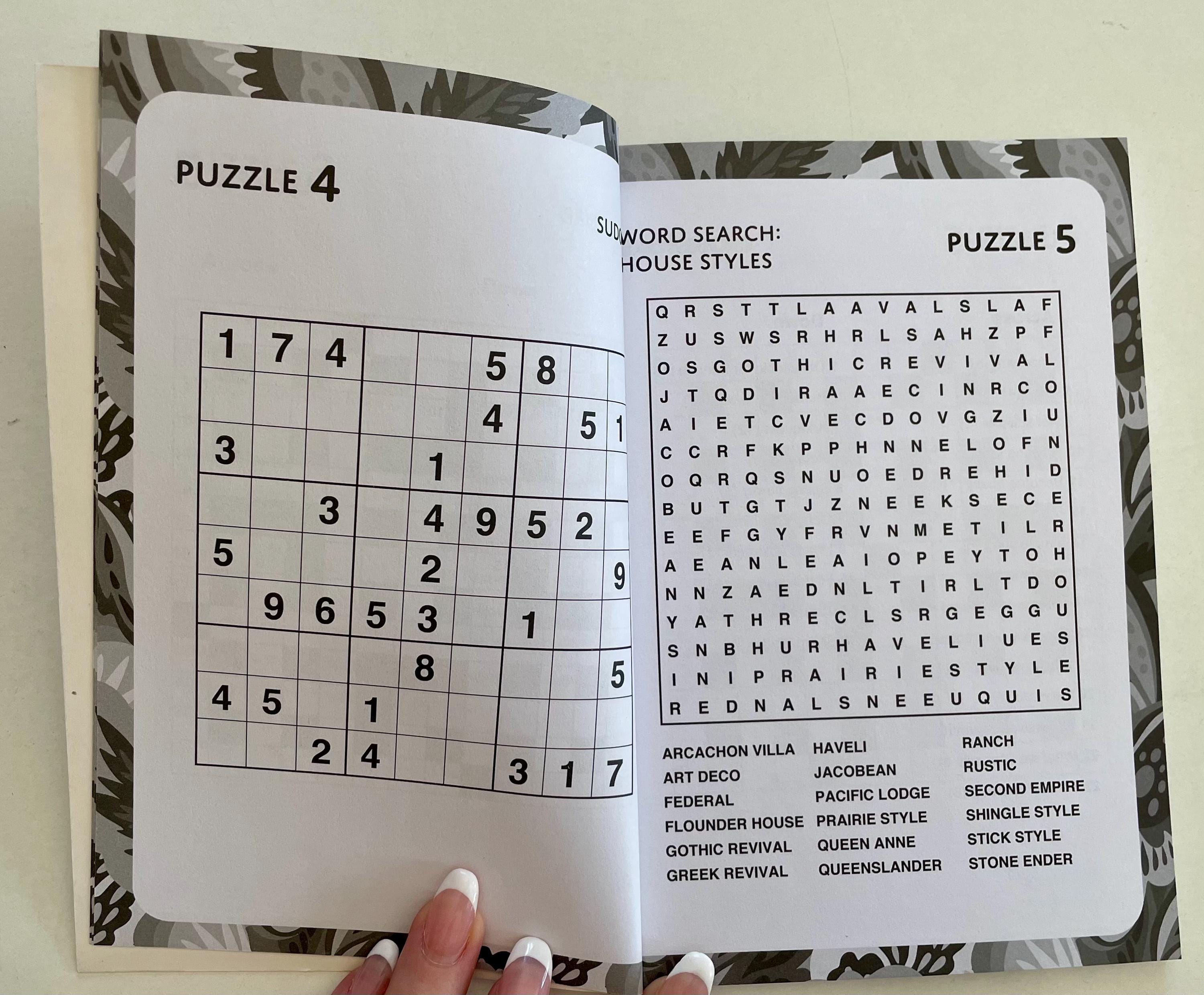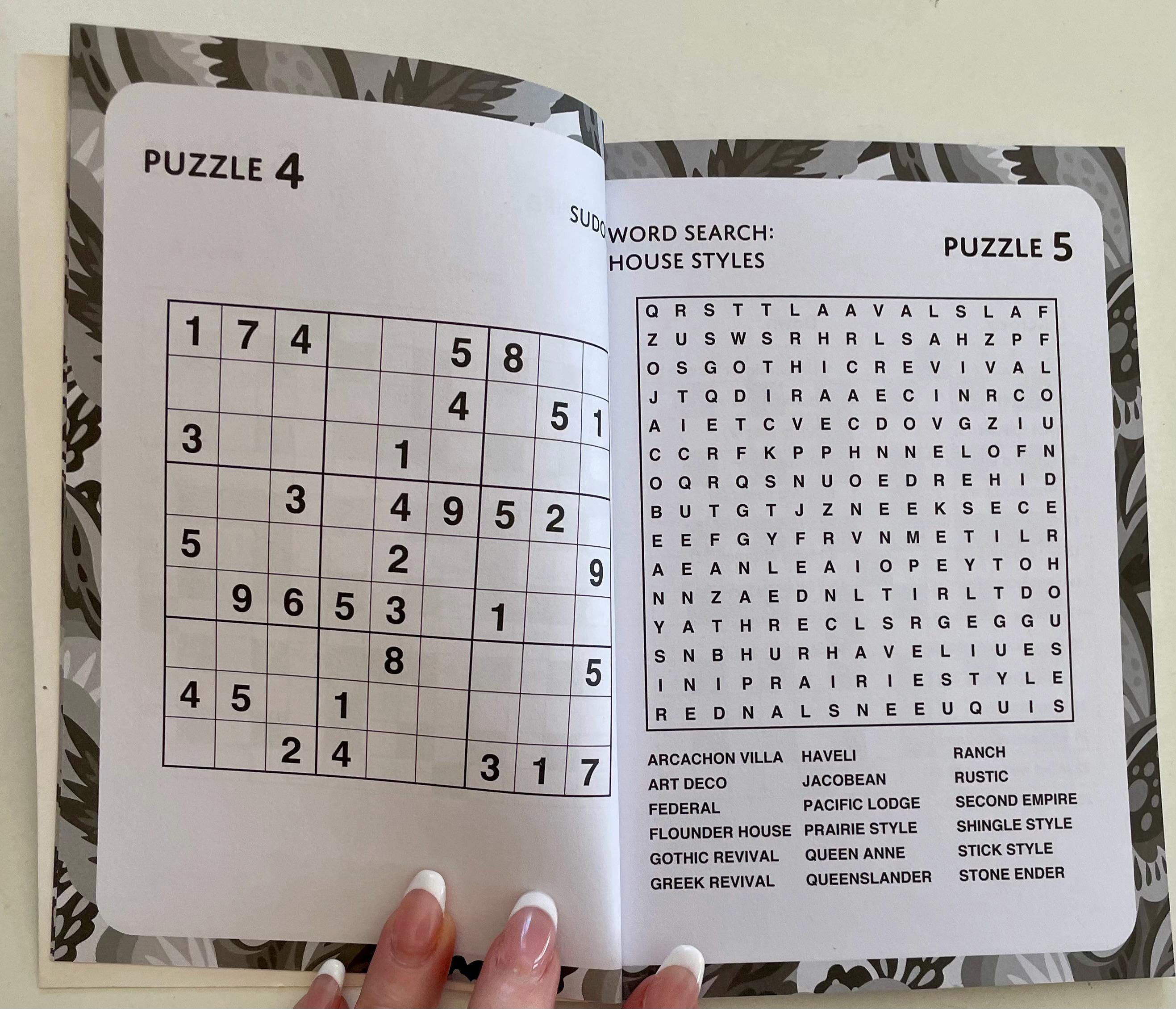Mixed Puzzles Paperback, 63 puzzles, word searches, sudoku, crosswords, 5” wide x 7” tall.