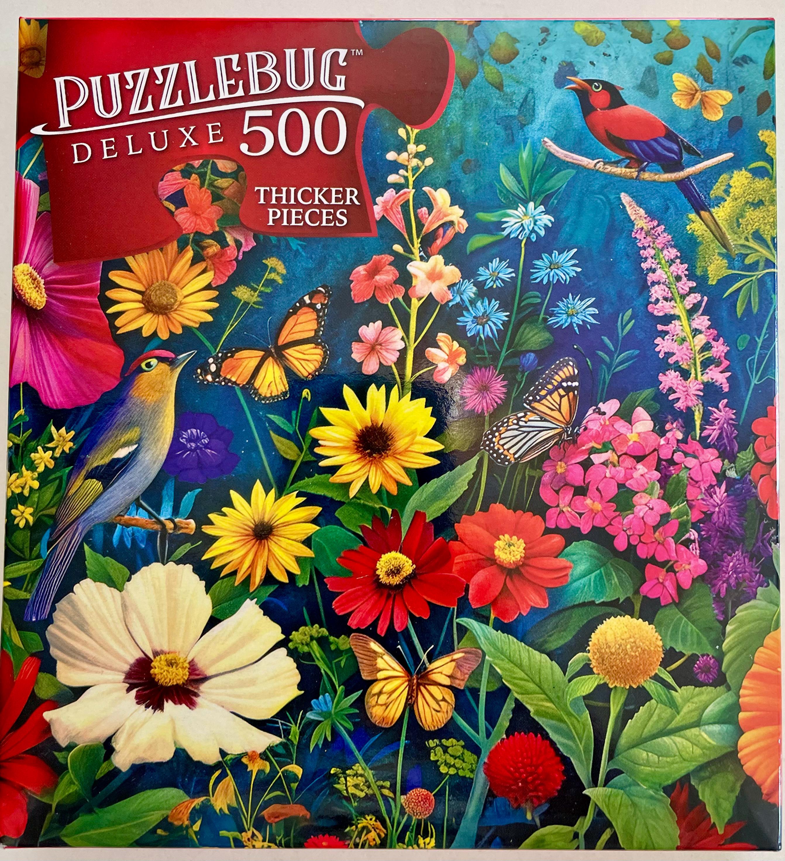 500 piece puzzle, 20 inches x 12 inches, floral scene.