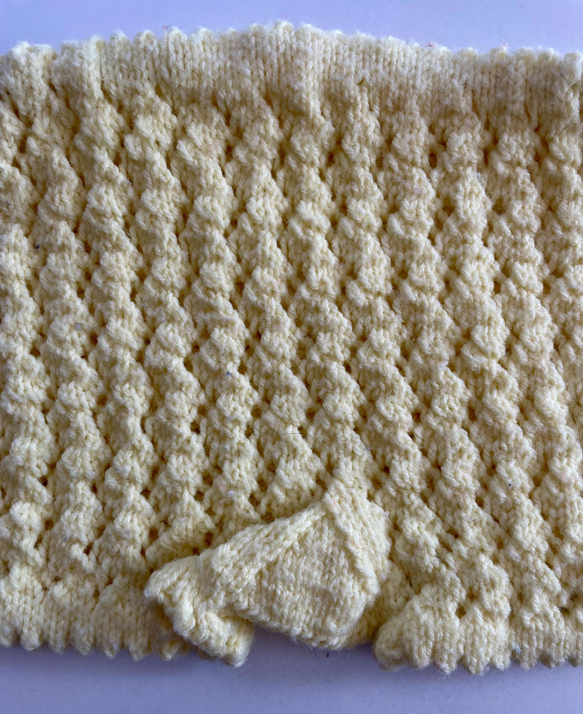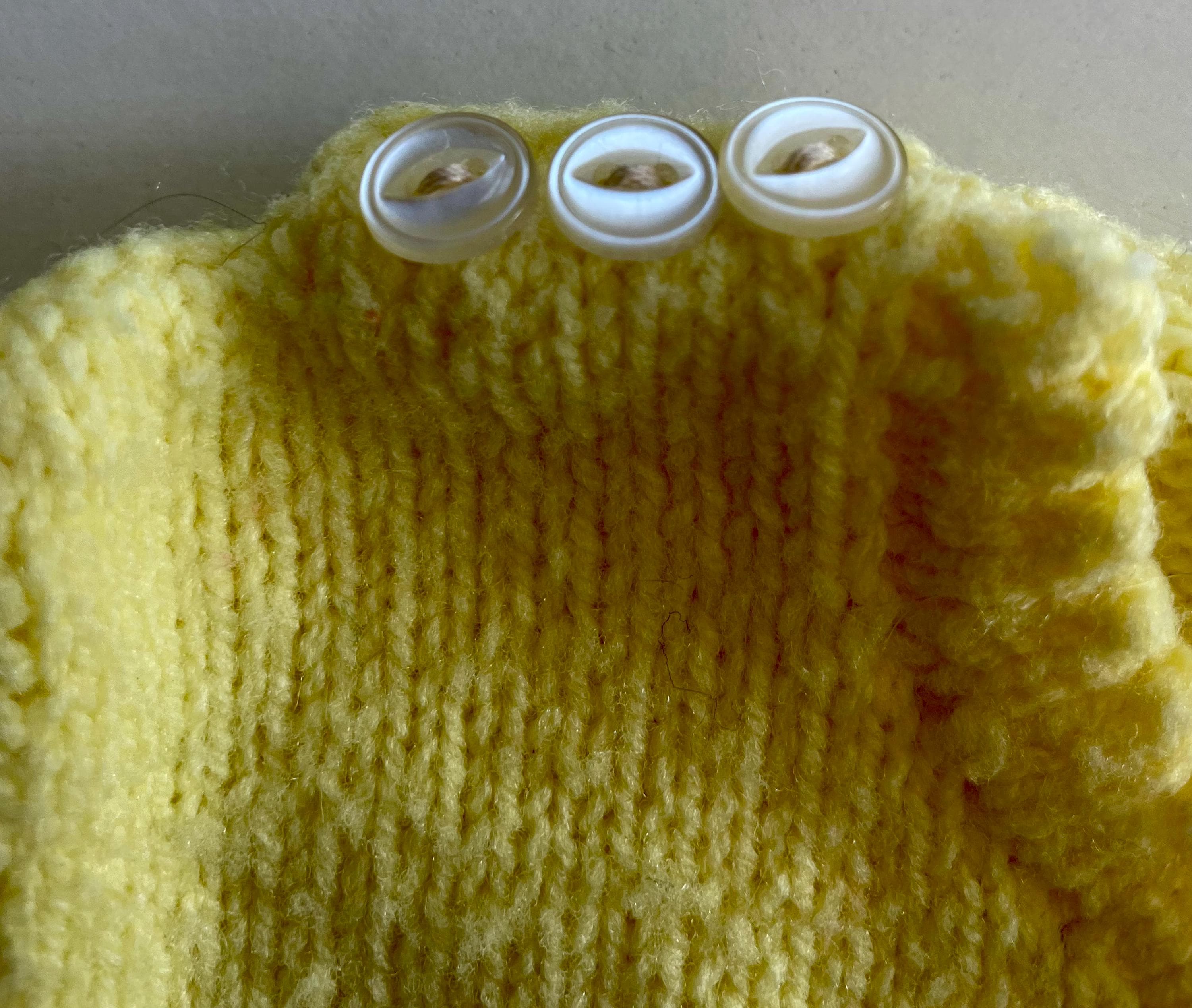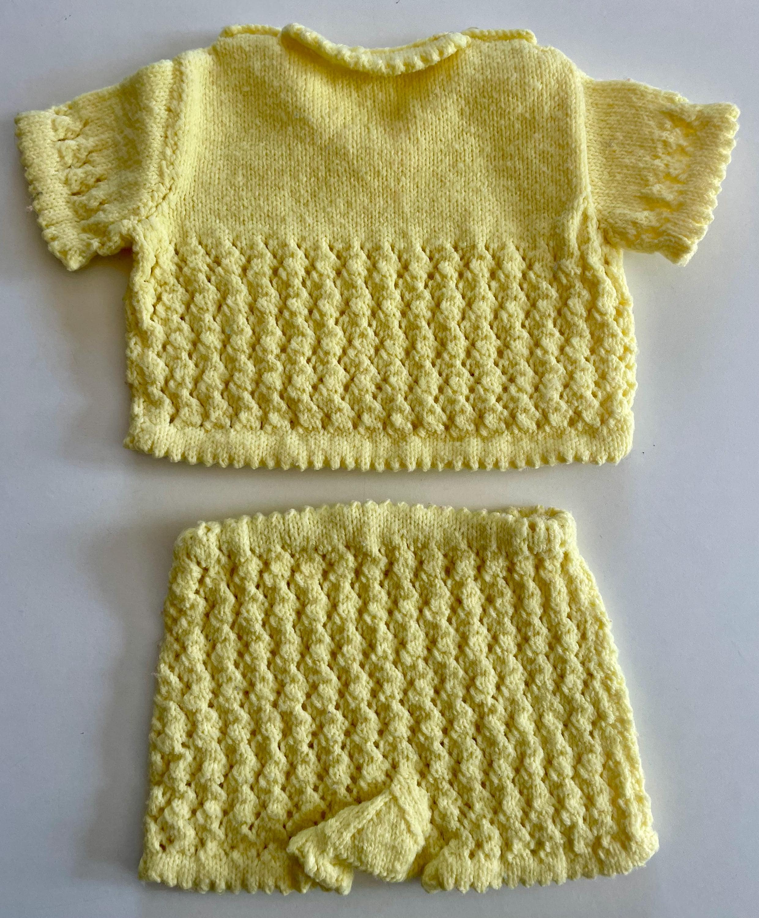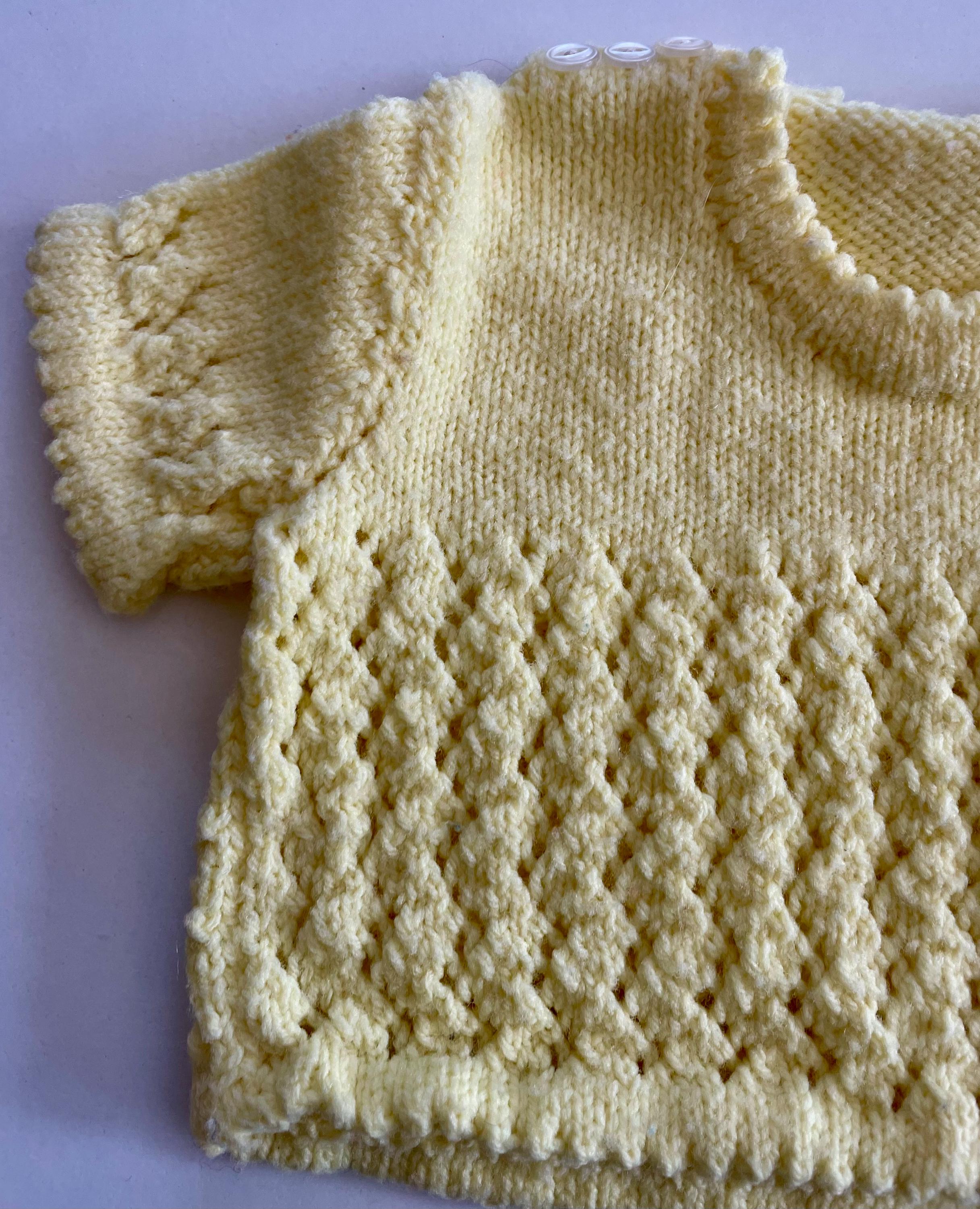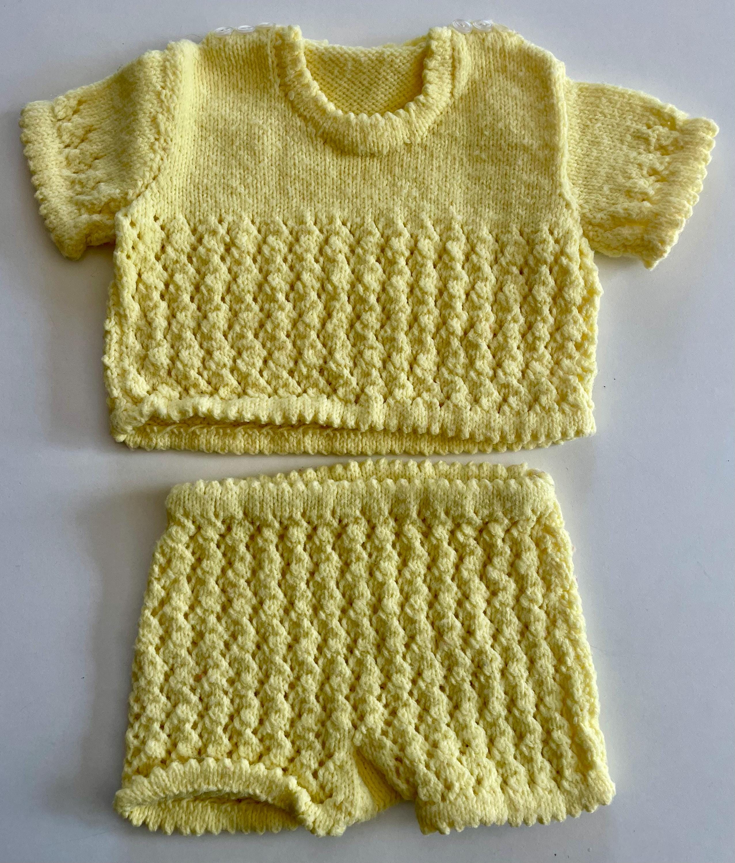 Hand knit baby set. Yellow top & shorts for newborn. Three buttons on either side of the neck.