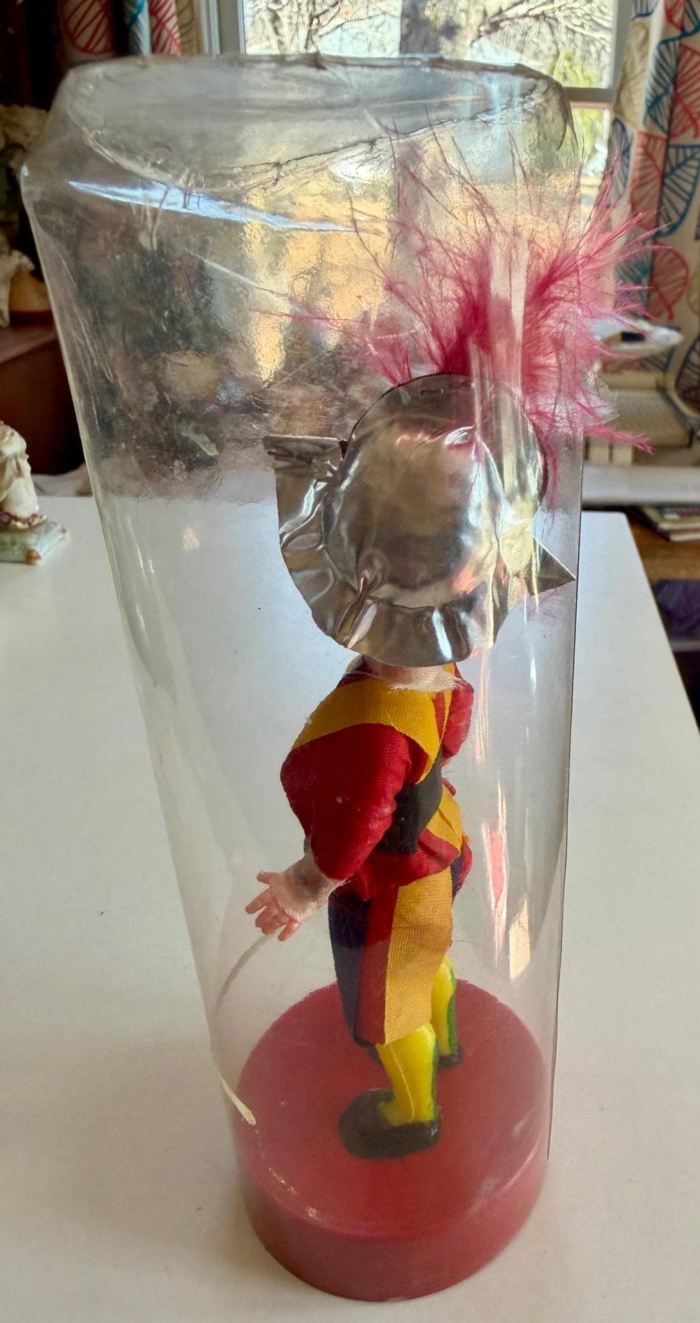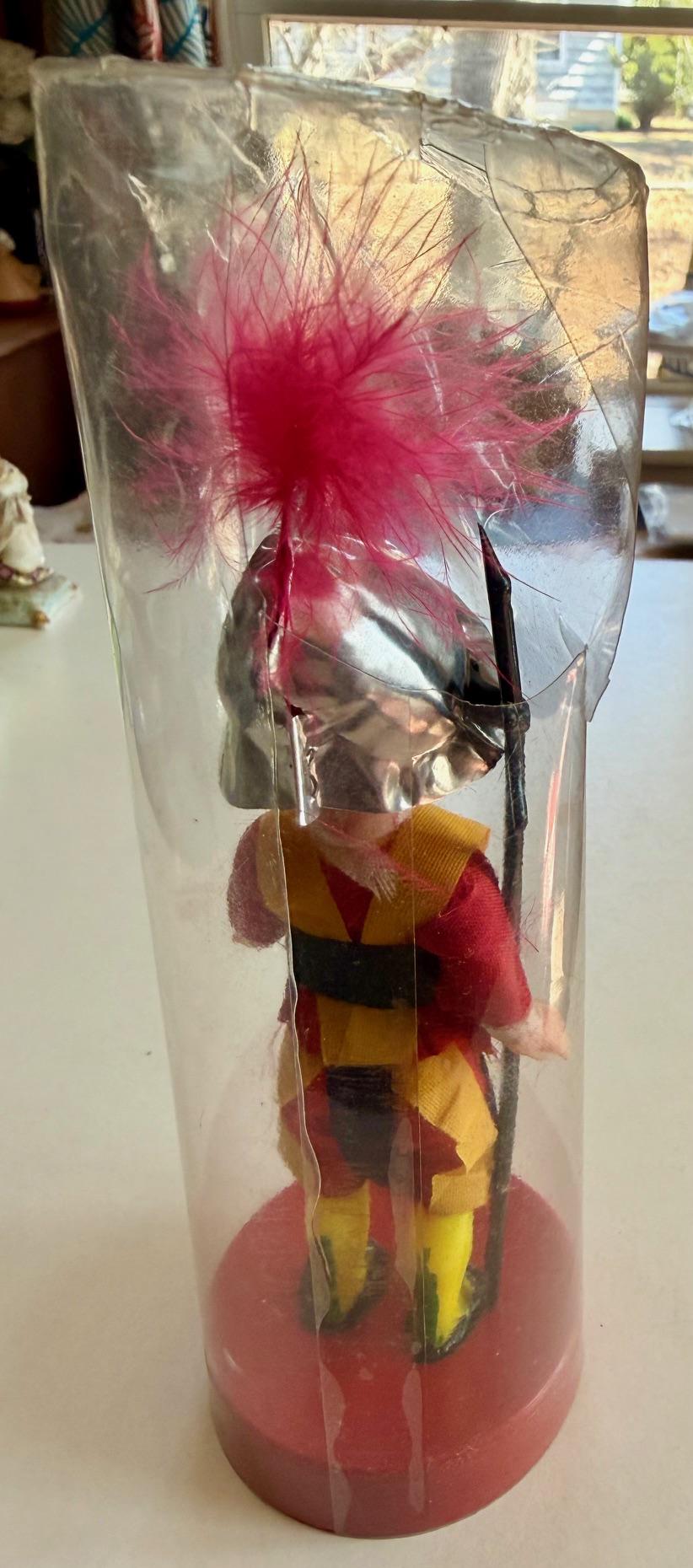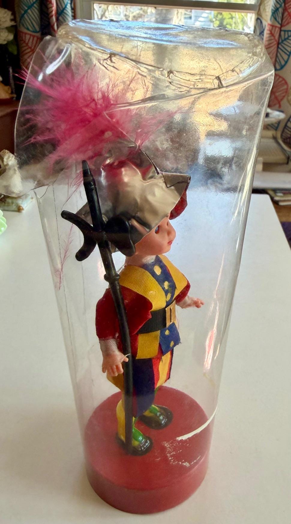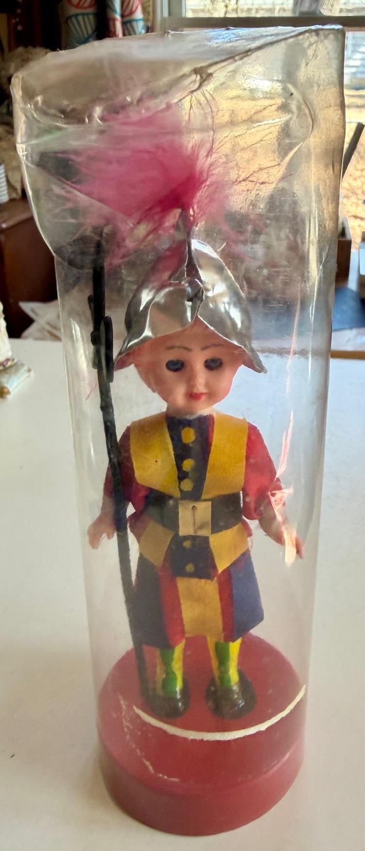 Vintage Italian souvenir doll dressed in the traditional uniform of the Pontifical Swiss Guard, likely dating to the mid-1960s.
